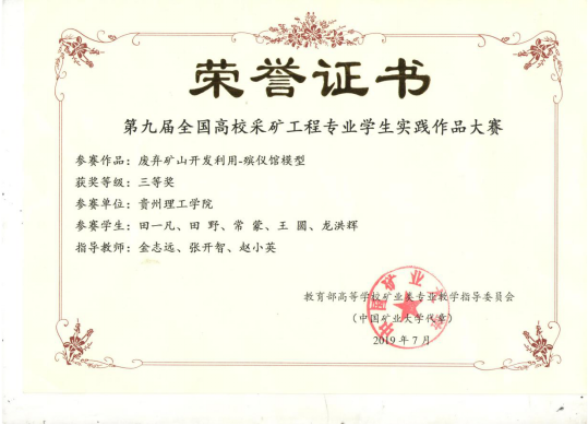 本网讯 7月21-24日,第33届全国高校采矿工程专业学术年会暨第九届全国高等学校采矿工程专业学生实践作品大赛和第三届青年教师讲课比赛在辽宁鞍山举行,我院金志远副教授和梁维副教授带领8名学生参加了本次学术年会,并在第九届全国高等学校采矿工程专业学生实践作品大赛中荣获二等奖1项、三等奖3项。