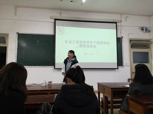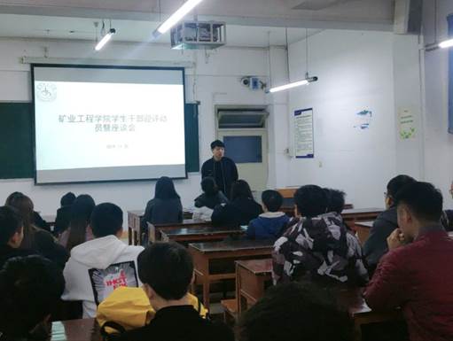 本网讯(司霜/文 陶刘俊/图) 2019年11月20日下午,矿业工程学院组织召开学生干部迎评动员会,院领导詹凤合、王庆出席会议。