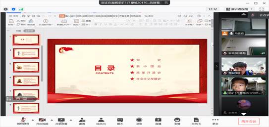 本网讯(周嗣贵/文 陈然 李彬/图) 2021年4月22日,矿业工程学院组织开展“庆祝建党一百周年 讲好四史故事”团支部书记上团课院内选拔竞赛,并利用腾讯会议向两校区同学分享活动实况。