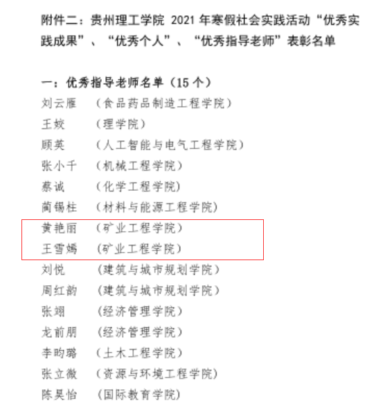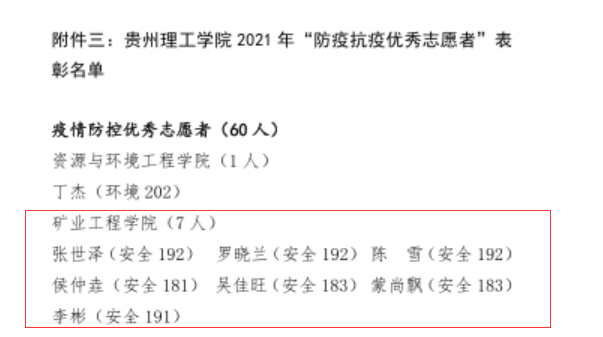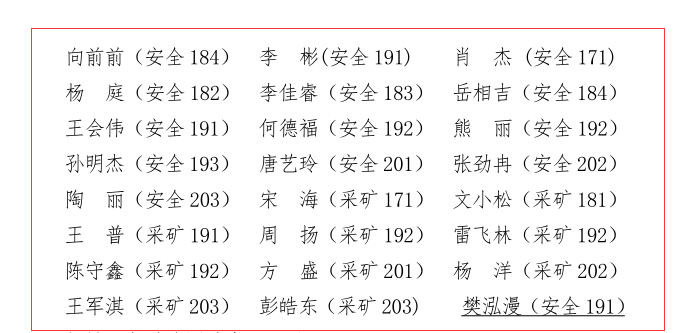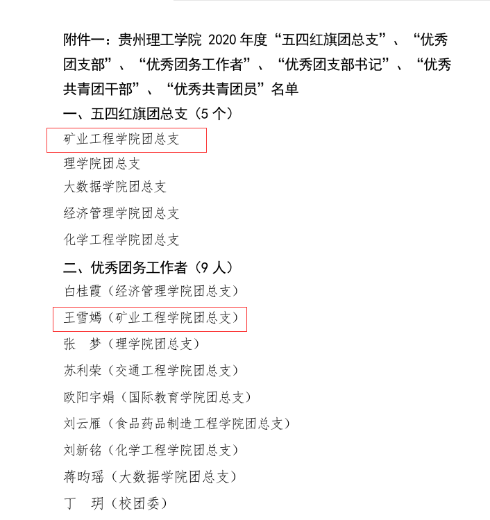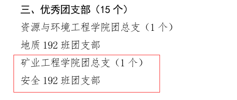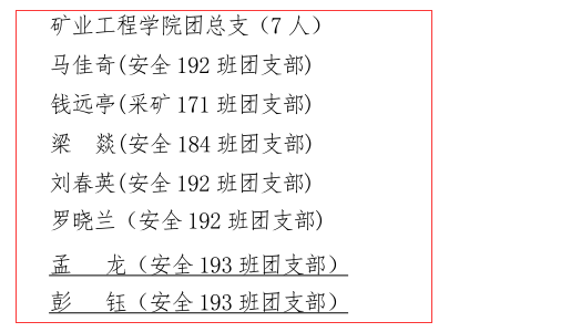其中,矿业工程学院团总支荣获“五四红旗团总支”;王雪嫣老师荣获“优秀团务工作者”;黄艳丽老师和王雪嫣老师荣获“寒假社会实践优秀指导老师”;安全192班团支部荣获“优秀团支部”;安全192班团支书刘春英荣获“优秀团支部书记”;马佳奇等7名同学荣获“优秀共青团干部”;向前前等24名同学荣获“优秀共青团员”;蒙尚飘等7名同学荣获“疫情防控优秀志愿者”。我院还荣获寒假社会实践优秀成果2项;吴念念同学荣获“寒假社会实践优秀个人”。