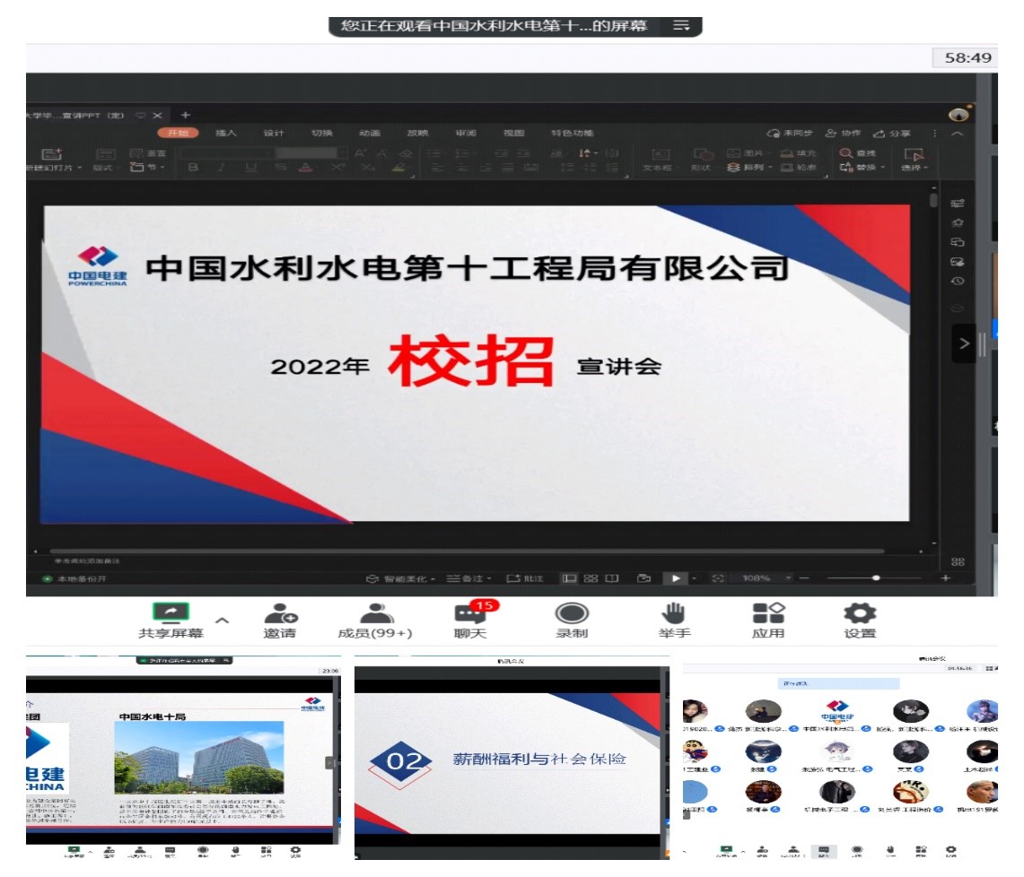 本网讯(杨再瑜) 2022年10月19日晚,我院携手中国水利水电第十工程局有限公司,通过线上方式举办了2023届毕业生专场宣讲招聘会。来自我院安全工程和采矿工程专业以及兄弟学院土木工程、材料与能源工程、机械设计制造及自动化等专业共计180余人参加本次宣讲招聘会。