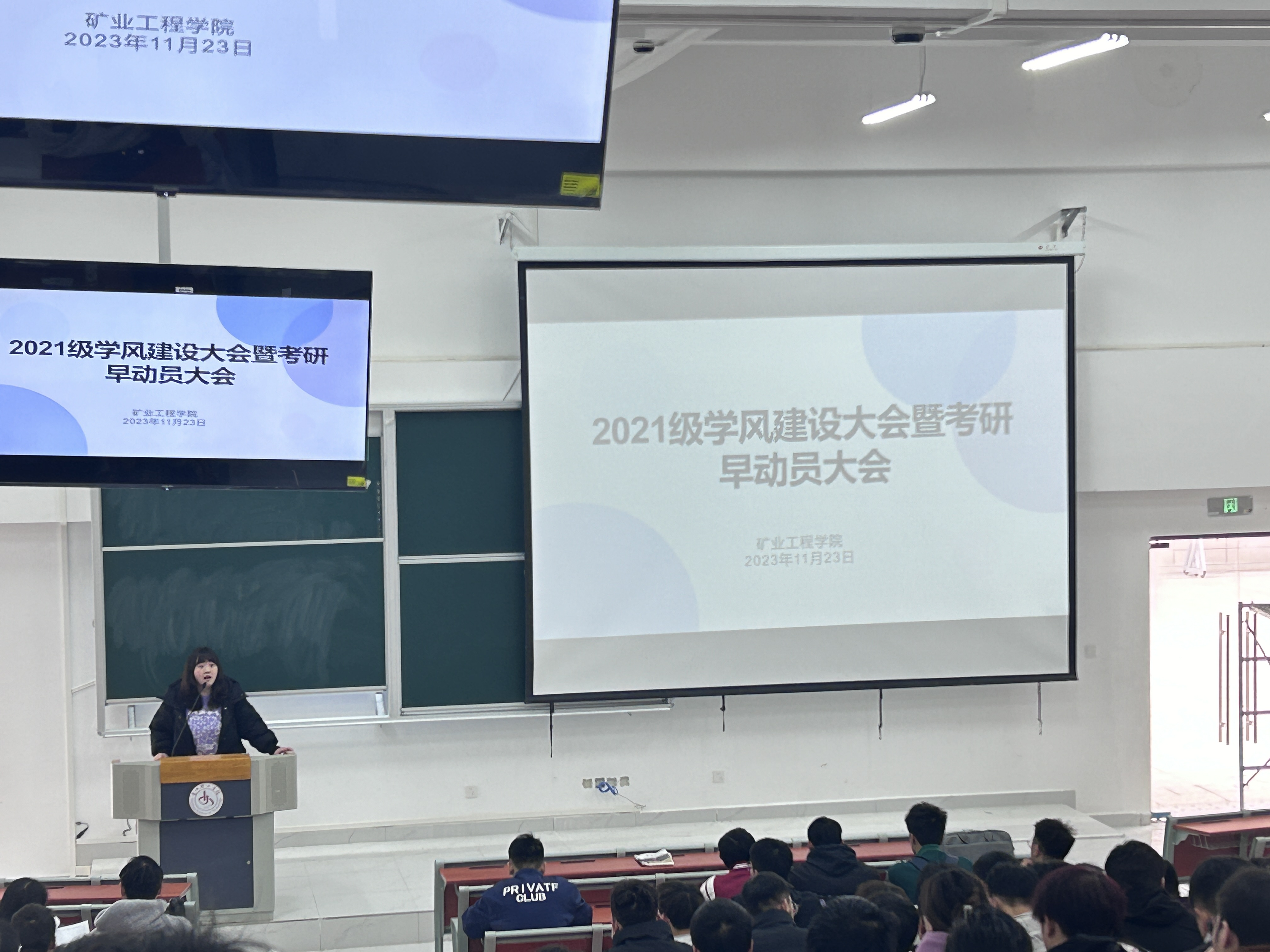 本网讯(矿业工程学院 敖威/文 李龙强/图) 为进一步加强学风建设,在前期对学院2021级学生近期学习情况调研的基础上,2023年11月23日,矿业工程学院组织召开了2021级学风建设大会暨考研早动员。