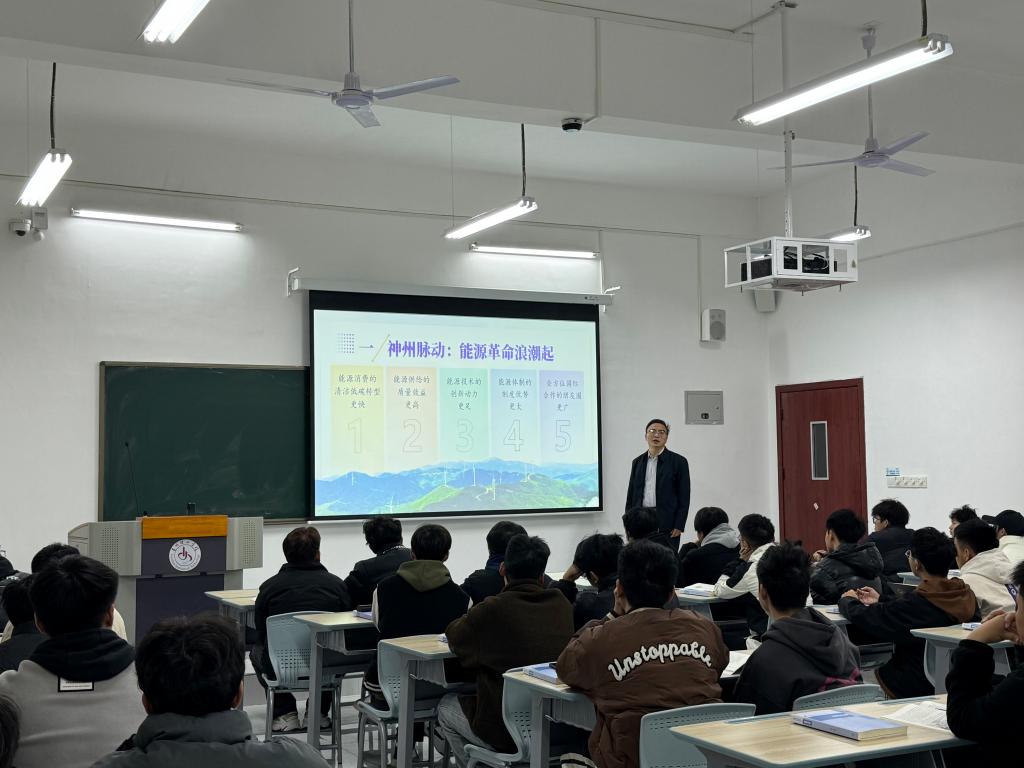 张开智副校长以能源的重要地位引入,从“四个革命、一个合作”五个方面,为同学们讲述了在全球能源科技创新进入空前密集活跃期、全球能源版图加速重构的背景下,我国浪潮涌动的能源革命,围绕“双碳”目标,结合典型案例和统计数据,以及同学们所学的采矿工程专业和贵州省“富矿精开”战略等,使大家更加真切地感受到能源消费革命、能源供给革命、能源技术革命、能源体制革命和加强全方位国际合作带来的变化和取得的成就。在此基础上,告诉同学们我国能源转型仍然面临着能源需求压力巨大、能源供给制约较多、绿色低碳转型任务艰巨等挑战,破局之路在于大力发展新能源,并介绍了我国新能源发展的优势及挑战,引导同学们正确认识新能源高质量发展问题,正确认识传统能源与新能源的关系,积极投身能源绿色低碳转型实践。