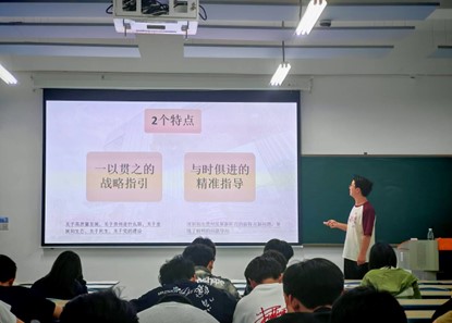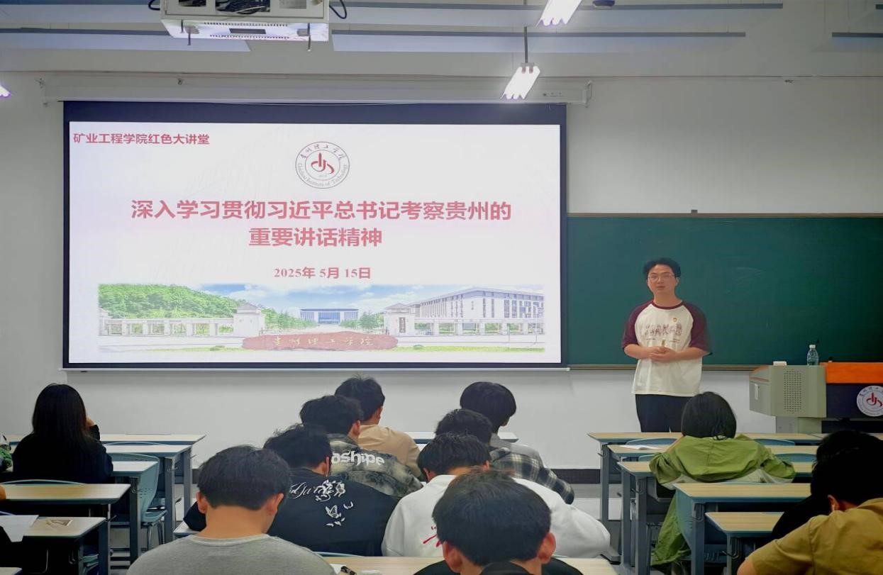 本网讯(刘胜益/文 刘芷瑜/图) 2025年5月15日,矿业工程学院学生党员刘胜益在B01-305教室为2024级智能采矿工程专业同学宣讲习近平总书记考察贵州重要讲话精神。