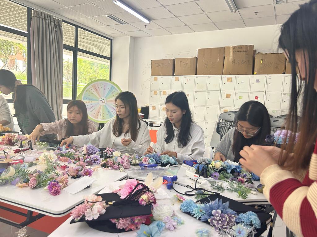 活动现场准备了热熔胶、各类仿真花及装饰材料,在老师们的悉心指导下,同学们充分发挥创意,精心挑选各式材料,将四载芳华凝于指尖。当一顶顶绽放的"花冠"在镜头前闪耀,时光仿佛在这一刻变得柔软。这场小而美的活动,不仅让毕业生们收获了独一无二的毕业纪念,更让毕业季充满了诗意与温度。