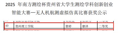 (本网讯)2025年5月24日,2025年南方测绘杯贵州省大学生测绘学科创新创业智能大赛圆满落幕。矿业工程学院首次组队参赛便崭露头角,6名参赛学生中4人荣获省级一等奖、1人荣获省级二等奖,一等奖获奖率超66%,创下学院在该赛事中的“开门红”。其中,4名一等奖获得者成功晋级全国总决赛,成为贵州理工学院表现亮眼的“新锐力量”。