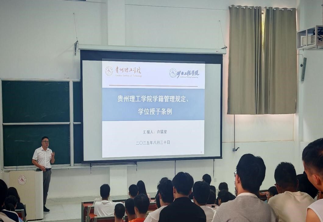 副院长许猛堂以《贵州理工学院学籍管理规定、学位授予条例》文件为主,为新生系统讲解了学籍管理规定和学业规划等内容,帮助同学们尽快熟悉大学期间的学习要求,引导学生明确学习方向与目标。
