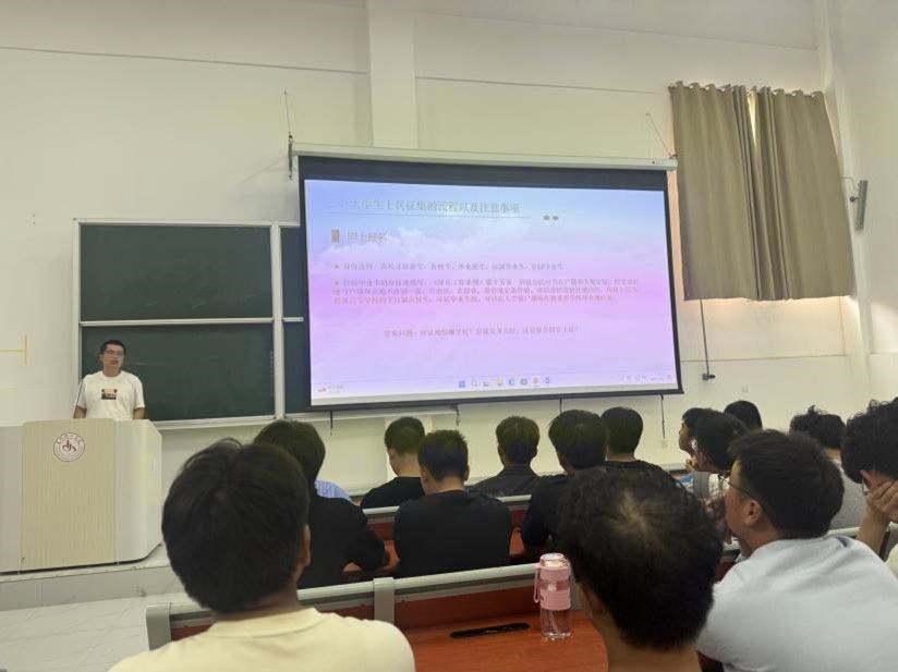 李老师重点开展了兵役法规政策宣讲,为同学们深入解读了《贵州理工学院关于鼓励在校大学生应征入伍的实施办法(2024年修订)》文件内容,引导同学们在校期间积极参加文体活动,强健体魄。同时,简要介绍了第二课堂学分修读的相关要求。