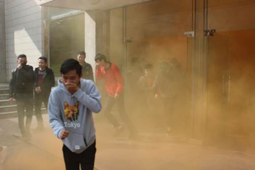讲座结束后,组织同学们开展了逃生演练。演练现场,逸夫报告厅门外突然浓烟滚滚,接着警报响起,同学们没有慌乱,更没有因为是演练而嬉戏打闹,而是在志愿者协会人员的引导以及学校保卫人员的协助下,有序而快速地撤离到安全地带。