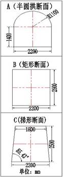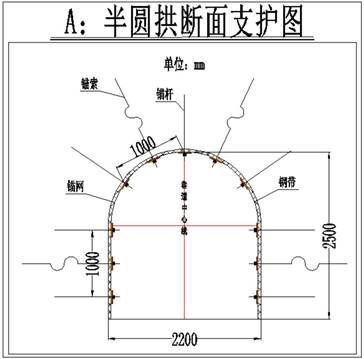 A巷道断面为半圆拱形,底部矩形净宽2200mm,净高1400mm,半圆拱半径1100mm,S净=4.97m2。