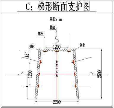 C巷道为梯形断面,上净宽1800mm,下净宽2200mm,净高2500mm,S净=5m2。