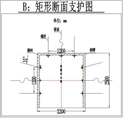 B巷道断面为矩形,净宽2200mm,净高2500mm,S净=5.5m2。