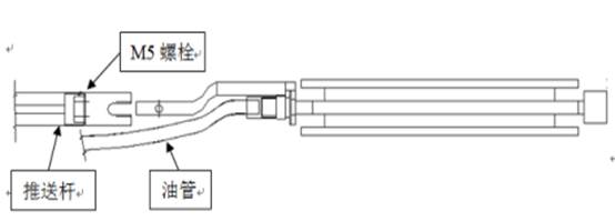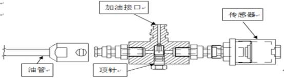 3)对接加油接口、油管插头和传感器接头。加油接口对接手动泵,松动顶针2圈,开始加压至应力传感器显示初始压力(2MPa-3MPa)。拧紧顶针,断开加油接口,套上密封套即可,把推送杆抽出。如图所示。