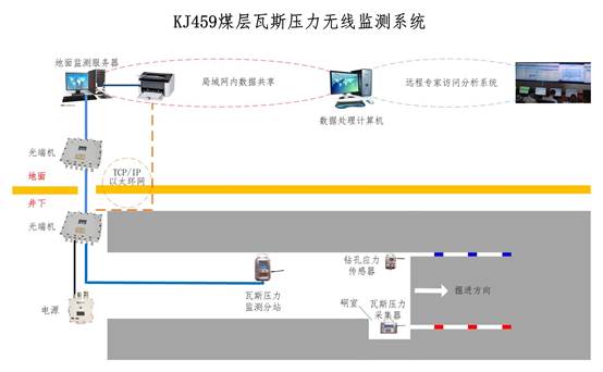 KJ459系统是全国首套煤层瓦斯压力无线监测系统,能够对掘进工作面超前和回采工作面超前范围内的瓦斯压力、煤体应力进行实时在线监测,实现监测结果的实时动态显示,直观展示瓦斯压力、煤体应力变化趋势;对监测区域瓦斯灾害危险程度进行实时动态评价,及时确定危险区域;系统具有分区分级报警功能,实现瓦斯灾害预警;系统监测信号采用无线传输方式,显著提高了灵活性。