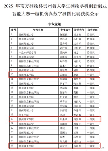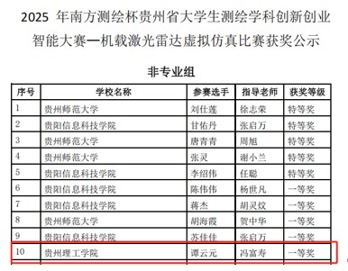 (本网讯)2025年5月24日,2025年南方测绘杯贵州省大学生测绘学科创新创业智能大赛圆满落幕。矿业工程学院首次组队参赛便崭露头角,6名参赛学生中4人荣获省级一等奖、1人荣获省级二等奖,一等奖获奖率超66%,创下学院在该赛事中的“开门红”。其中,4名一等奖获得者成功晋级全国总决赛,成为贵州理工学院表现亮眼的“新锐力量”。