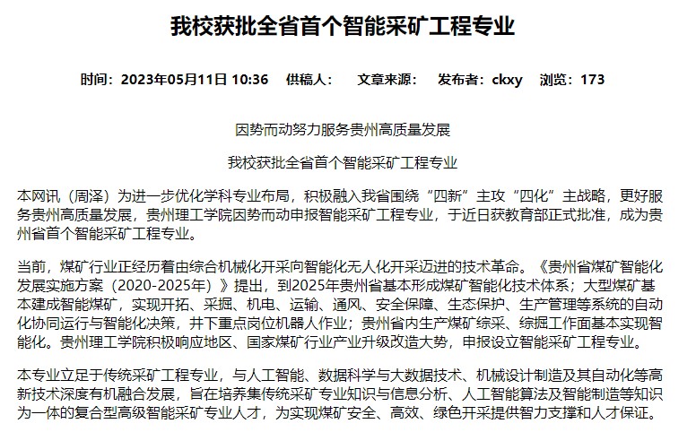 贵州理工学院采矿工程专业于2016年开始首批招生,建有省级专业综合改革示范点、省级一流课程、省级一流实验教学平台,2020年被贵州省教育厅确定为贵州省一流本科专业建设点。采矿工程专业建设以培养服务贵州十大千亿级产业“基础能源”的采矿工程高素质应用型人才为目标,通过强化实践教学,完善课程体系,优化课程结构,改革教学方法,着力提升人才培养质量,把采矿工程建设成为服务煤矿行业机械化、自动化、智能化转型升级特色鲜明的应用型专业。采矿工程专业注重培养学生的实践能力和创新精神,为学生提供了高质量的教学和实践环境。同时,学院也致力于科研创新和服务地方经济发展,为地方和国家培养了大量优秀的采矿工程人才。