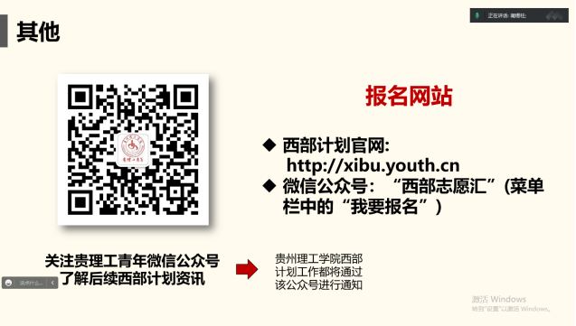 为进一步做好大学生志愿服务西部计划工作,号召更多的青年到西部去、到基层去、到祖国最需要的地方去。2023年4月17日晚,材料与能源工程学院利用腾讯会议开展西部计划宣讲,此次宣讲由辅导员蔺锡柱老师主讲,2019级100余名学生参加。