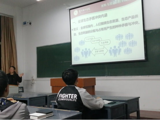 伍院长为大家讲述了全球生态的矛盾冲突,其中主要内容有:全球生态矛盾冲突的内涵、表现形式、根源以及化解矛盾冲突的基本途径;伍院长把这些内容逐一为大家详细分析,让大家了解到当前环境的严重性,呼吁大家应用自己的实际行动来保护我们共同的家园。同时,她给大家讲述了一些只顾发展不注重生态环境的国家遭受的环境的惩罚,致使本国人民受到伤害的事件,比如1956年日本水俣病事件以及1952年的伦敦烟雾事件,这些都让无辜的人民身体健康受到了严重危害。