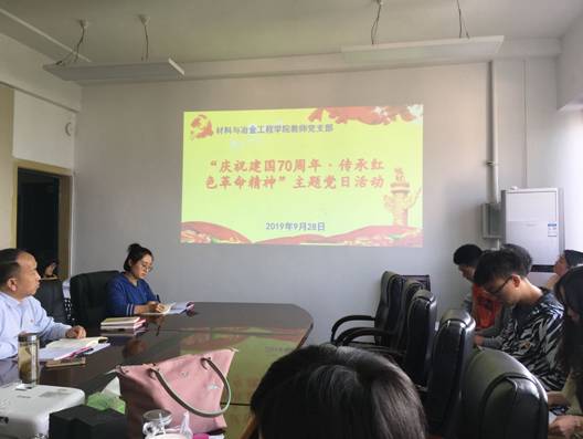 为热烈庆祝中华人民共和国成立70周年,大力弘扬爱国主义精神,传承红色基因,结合“不忘初心、牢记使命”主题教育,引导党支部师生党员深入学习老一辈共产党人的初心使命和忠诚担当精神,抒发爱国之情,2019年9月28日上午9:00材料与冶金工程学院教师党支部在综合楼802会议室开展“庆祝中华人民共和国成立70周年 传承红色革命精神”主题党日活动,党支部师生党员参加此次活动,学校“不忘初心、牢记使命”主题教育巡回指导二组何凤同志出席会议,会议由党支部书记李娟主持。