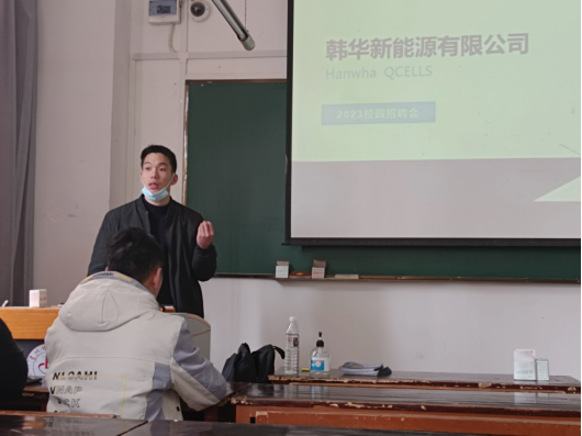 2023年3月9日上午,韩华新能源有限公司人力资源部负责人郭俊杰先生,在3教108,为我院2023届毕业生进行企业招聘宣讲。