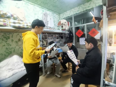 图为学生干部进寝室张贴防电信诈骗海报