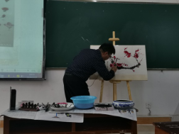讲座过程中,夏老师首先介绍本次讲座的内容与意义,接着就带着学生们一起了解祖国的灿烂文化及国画四君子——梅、兰、竹、菊,一起走进国画梅花与欣赏梅花诗句。此外,还为同学们展示了中国画梅名家的优秀作品,同时,夏老师在现场亲自展现国画梅花画法,没多久,一幅精彩的梅花作品就浮现在同学眼前。最后,夏老师为此次讲座做总结,希望大家如梅花一般,顽强拼搏、自强不息。