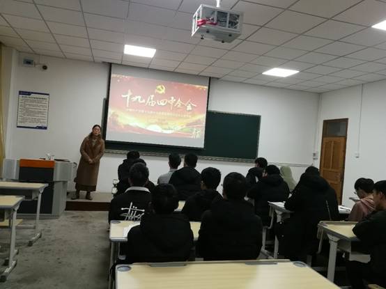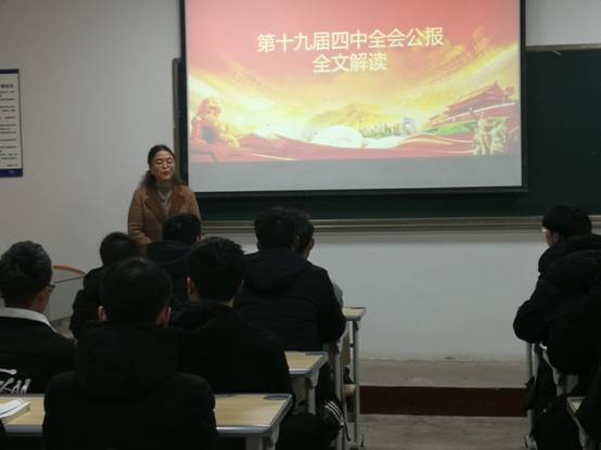 本网讯 (材料与冶金工程学院 文字/杨江 图片/杨明)为了使同学们了解中国特色社会主义基本国情,具备良好的思想政治素质,实现自己的社会价值。2019年12月18日10点在2教107教室,伍玉娇院长深入材料181班开展了一场关于“第十九届四中全会公报全文解读”的讲座,班主任杨江和全体181班同学参加了此次活动。