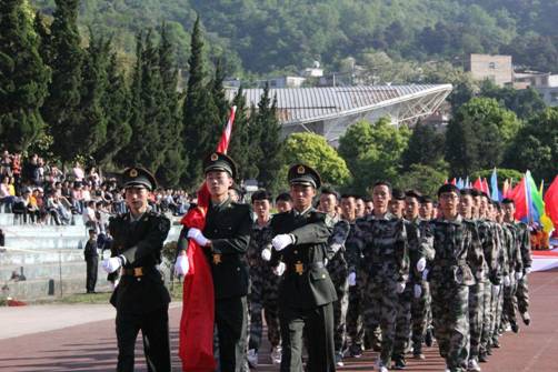 开幕式正式开始,护旗方队踏着整齐的步伐率先经过主席台接受检阅,整齐的军装,有力的步伐为后面的方队做出了榜样;各个表演方队紧接其后,在主席台前,他们的动作整齐划一,精彩的表演赢得了观众热烈的掌声;15支学院方阵代表队压轴出场,或变换队形、或挥舞花球,口号嘹亮、气势恢宏。