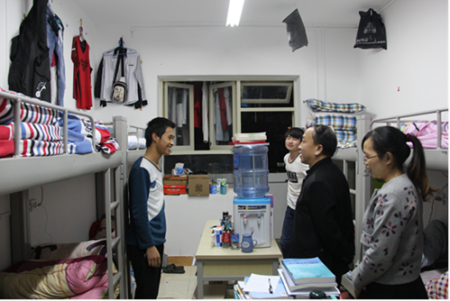 但与此同时,仍发现个别宿舍“不达标”存在卫生死角,空气质量较差,电线随意拉等安全问题,检查组及时指正,督促改善宿舍学习生活环境。对于男生寝室八人间,住起来略显拥挤,潘书记给出建议:同学们可以购买床上电脑桌,一是充分利用床上剩余空间,二是给寝室留出了更大的空间用于学习。