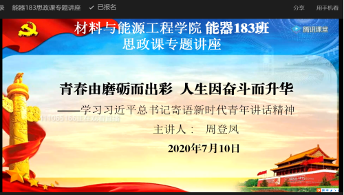 本网讯(材料与能源工程学院 文字/孙家琪 图片/孙家琪)为了使同学们更加了解新时代社会主义青年担当,勉励新时代青年牢记总书记的谆谆教诲,勇敢肩负起时代和人民赋予的重任,在新时代中勇于放飞青春梦想,努力创造无愧于党、无愧于时代、无愧于青春的大好人生,2020年7月10日10点,能器183班联系导师周登凤副院长通过网络平台开展了题为《青春因磨砺而出彩,人生因奋斗而升华》专题讲座,班主任王万坤教授和能器183班全体同学参加了此次活动。