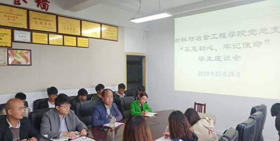 本讯网(材料与冶金工程学院 文字/王妍 王礼鹏 图片/王礼鹏)2019年10月25日13:30,材料与冶金工程学院党总支在综合楼802会议室召开“不忘初心、牢记使命”学生座谈会。学生党员、入党积极分子和学生代表共计22人参加,潘健林主持会议。