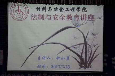 为了让法制走进校园,进一步增强大学生的法治观念和法律意识,自觉遵纪守法,学会用法律进行自我保护,做一个知法、守法的合格大学生,2017年3月23日19:00,材料与冶金工程学院全体学生及在逸夫小报告厅共同聆听了学校保卫处钟小勇老师的“法治与安全教育”知识讲座。出席此次会议的学院领导及老师有:潘健林副书记,学生科负责人罗咏梅,辅导员张玉兰。