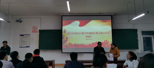 本网讯(材料与能源工程学院 文字\方永其 图片\孙玉)2020年11月5日,材料与能源工程学院党总支书记潘健林为材料174班和能器174班作了以“树立红线意识•遵守校规校纪•做合格大学生”为主题的思政教育。