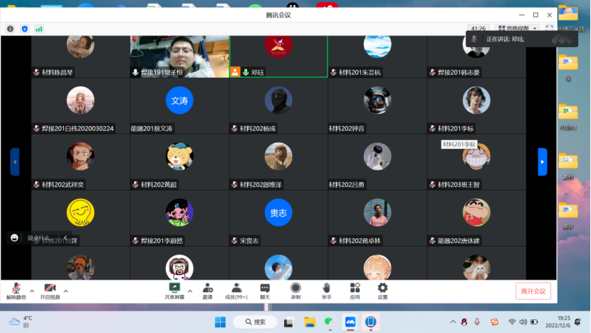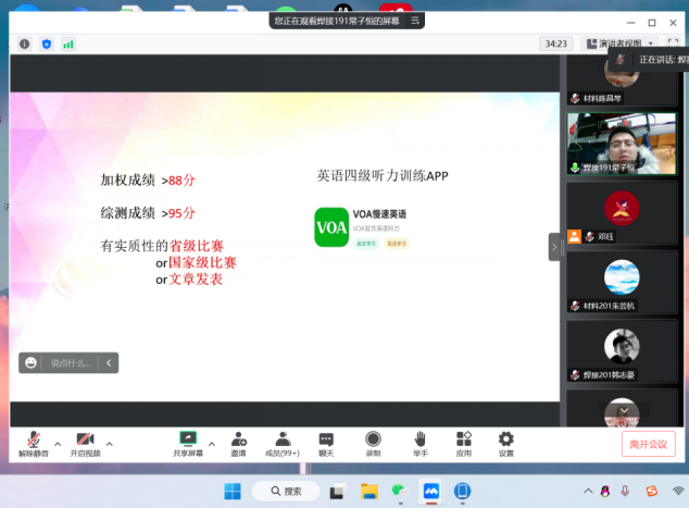 2022年12月6日晚,材料与能源工程学院举办了学习经验分享会,主讲人为2022年国家奖学金获得者——焊接191班的常子恒。此次分享会由辅导员邓珏主持,学院140余名同学参与学习。