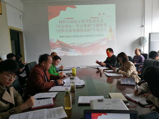 本网讯 (材料与冶金工程学院 李杨/文字 李杨/图片)根据学校“不忘初心、牢记使命”主题教育中对照党章党规找差距的有关文件精神和安排,2019年11月8日下午2:00,材料与冶金工程学院教师党支部在行政楼802会议室开展“不忘初心、牢记使命”主题教育“对照党章党规找差距”专题会议,党支部师生党员参加会议,学校“不忘初心、牢记使命”主题教育巡回指导二组杜玉红同志到会指导,会议由学院党总支书记潘健林同志主持。