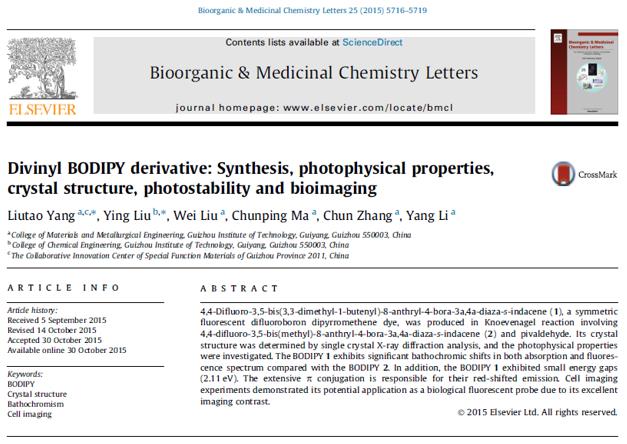 我院杨柳涛副教授(博士)的研究论文“Divinyl BODIPY derivative: Synthesis, photophysical properties, crystal structure, photostability and bioimaging”发表在“Bioorganic & Medicinal Chemistry Letters”期刊2015(25):5716-5719。
