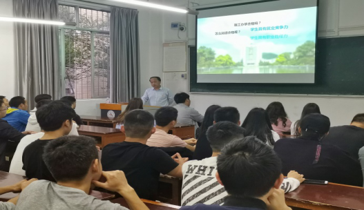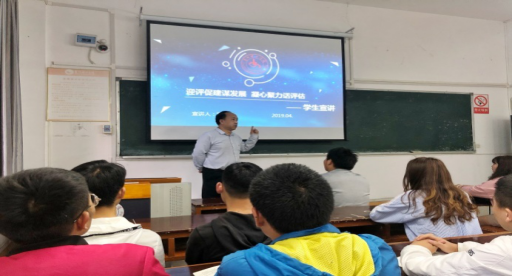 本网讯(材料与冶金工程学院 文字/朱静文 图片/朱静文)2019年本科教学工作合格评估,是学校当前最大的政治任务和最重要的工作,为了让学生认识到评建工作人人有责,评估成效事关每个理工人的切身利益,做到“千斤重担人人挑,个个身上有指标”,2019年4月18日在三教102教室,材料与冶金工程学院党总支书记潘健林为能器174班开展了“迎评促建谋发展,凝心聚力话评估”的评估知识宣讲。