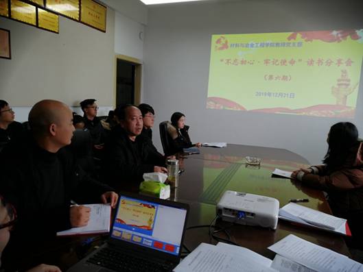 本网讯(材料与冶金工程学院 莫远科/文字 莫远科/图片)2019年12月21日下午,材料与冶金工程学院教师党支部在行政楼802会议室开展“不忘初心、牢记使命”主题教育之读书分享会,即学习“时代楷模”陈立群同志先进事迹主题党日活动,师生党员参加此次活动,会议由党支部书记李娟同志主持。