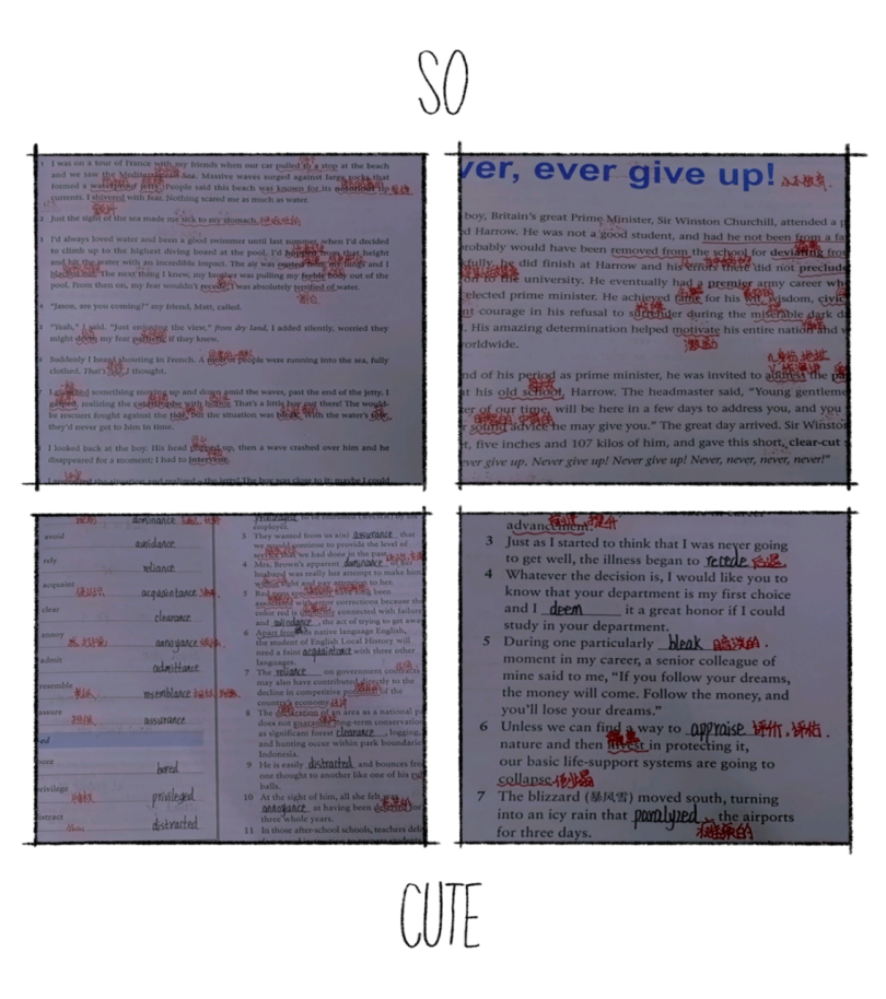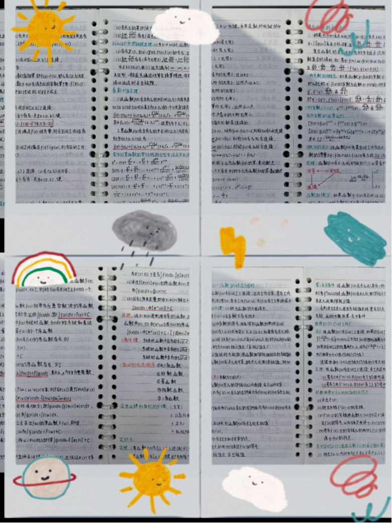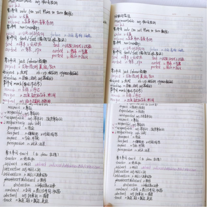笔记撰写各有各的特色,各有各的用处。为了方便我能快速找到相应的知识点和区分知识点,我会采用不同的颜色笔,并且用不同颜色来标记知识点的重要程度。习惯整理书本上的笔记也是增强记忆力的一种方式。你多写一遍,脑袋里就会跟着思考一遍,这样不仅增强了对知识点的记忆,同时也增加了对知识点的理解。在笔记做好的同时也要对知识点进行巩固,不然笔记的作用也会大打折扣。