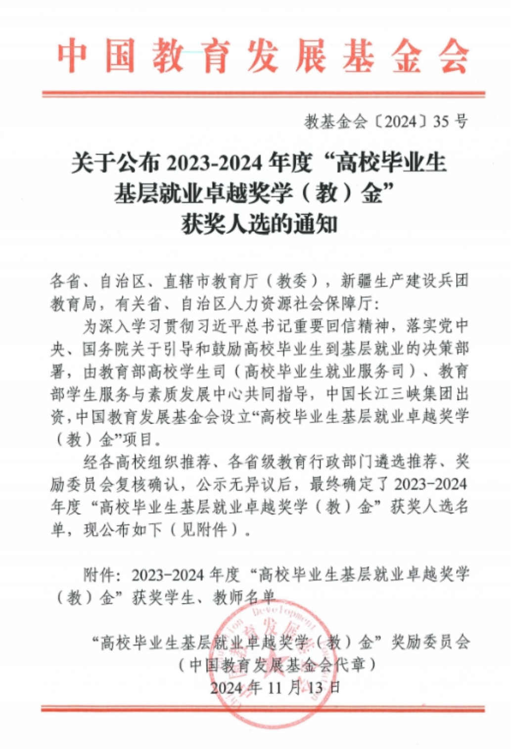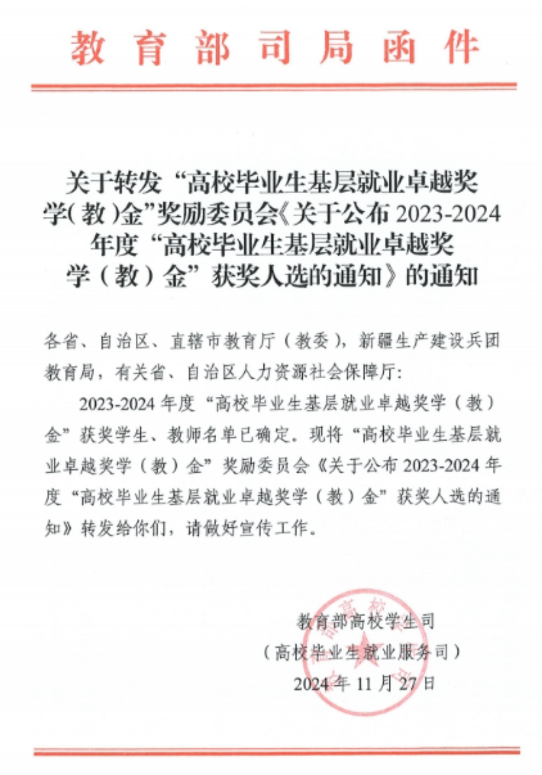 2024年11月27日,教育部高校学生司(高校毕业生就业服务司)通报,我院蔺锡柱老师获2023-2024年度“高校毕业生基层就业卓越奖学(教)金”。本年度全国共有398名优秀高校毕业生和60名优秀指导教师获得奖励。