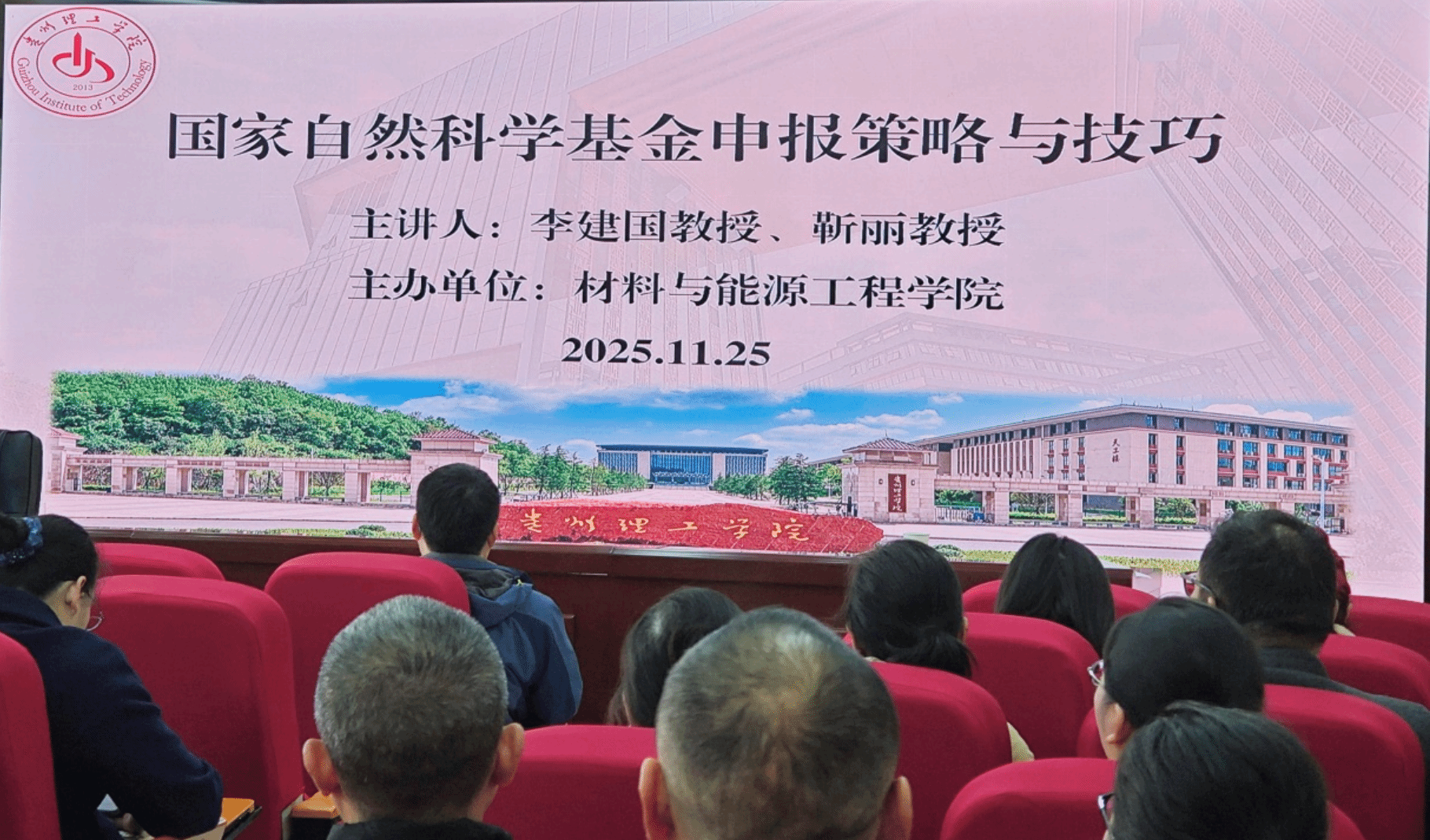 2025年11月25日上午,贵州理工学院科技处、材料与能源工程学院特邀上海交通大学李建国教授与靳丽教授莅临我校,在毓知楼429学院报告厅开展了一场关于“国家自然科学基金申报策略与技巧”的培训讲座。此次讲座旨在精准提升学校教师,特别是中青年骨干教师的基金项目申报能力与水平,为2026年度国家自然科学基金申报工作奠定坚实基础。