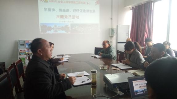 2018年10月9日,中共中央组织部、中共中央宣传部、国务院国资委党委印发《关于认真学习贯彻习近平总书记重要指示精神广泛开展向黄群、宋月才、姜开斌同志为代表的抗灾抢险英雄群体和王继才同志学习的通知》。为教育引导广大党员教师认真学习贯彻习近平总书记重要指示精神,学先进、做先进,紧紧围绕学校和学院中心工作,以提高教育教学质量为核心,扎实做好本科教学工作合格评估工作,着力开创学校和学院教育事业新局面,2018年11月20日中午1:00,贵州理工学院材料与冶金工程学院教工党支部全体党员教师在综合楼802会议室开展“学精神、做先进、迎评促建谋发展”主题党日活动,会议由教工党支部书记刘伟同志主持。