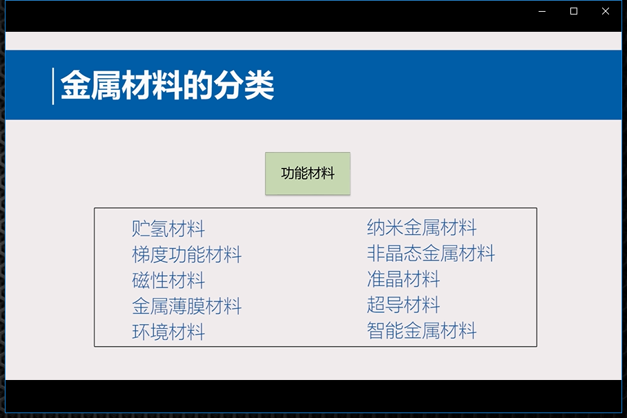 (储氢材料、梯度功能材料、磁性材料、金属薄膜材料、环境材料、金属纳米材料、非晶材料、准晶材料、超导材料、智能材料)