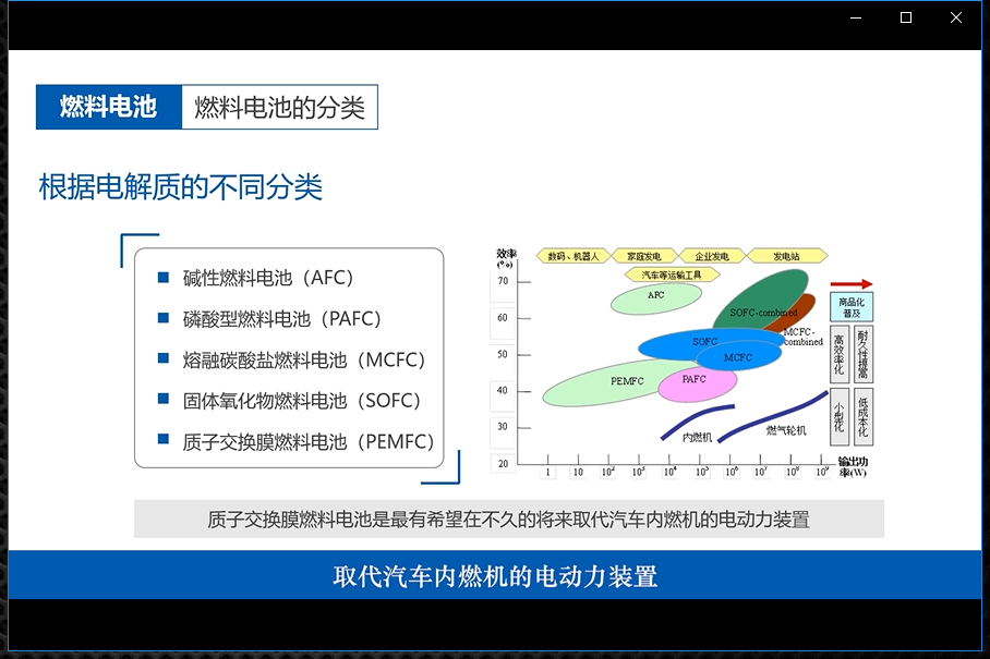 (燃料电池的特点、原理、卡诺循环、电化学发电器、储能元件、碱性燃料电池、磷酸型燃料电池、熔融碳酸性燃料电池、固体氧化物燃料电池、质子交换膜燃料电池、直接甲醇燃料电池、微型燃料电池、燃料电池在汽车领域、无人艇、深海探测、手机等领域的应用)