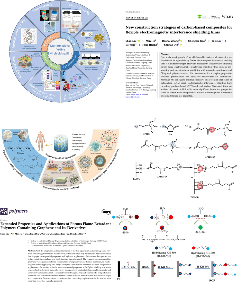 题为《Advanced polymer composites and polymer hybrids for cartilage tissue engineering》的论文介绍了用于软骨组织工程的聚合物聚合物复合材料和聚合物杂化材料,包括聚合物支架、聚合物生物润滑剂,以及用于药物缓释和靶向给药的两性离子聚合物,其力学性能、生物相容性、生物降解性、细胞毒性及其改性机理。题为《In situ crosslinking of silica aerogel with reactive carbon fiber for high mechanical property, thermal insulation and superhydrophobicity》的论文合成了一种新型硅羟基修饰的长碳链接枝碳纤维,制备具有化学交联结构的活性碳纤维-二氧化硅气凝胶。二氧化硅包覆在活性碳纤维表面,两者具有强界面相互作用,活性碳纤维阻碍了孔收缩,复合材料具有良好的力学性能、可剪裁性、热稳定性和亲水性。题为《Construction and application of flexible electromagnetic interference shielding films with multifunctionality》的论文描述了对具有多功能的柔性电磁屏蔽膜材料的要求和应用,包括透明度、导热性、焦耳热或光热响应、耐腐蚀性、压力传感和耐久性等,还提出了其制备方法和实现多功能性的策略。题为《New construction strategies of carbon-based composites for flexible electromagnetic interference shielding films》的论文探讨了制备碳基电磁屏蔽膜材料时,多组分、结构设计和界面工程之间的协同作用及其作用机制。题为《Surface Modification of Basalt Fibers with improved reactivity, thermal stability, and tensile strength》的论文将3-氨基丙基三甲氧基硅烷和琥珀酸酐接枝到玄武岩纤维上,引入了特定的官能团,提高其热稳定性,减少表面缺陷。活化过程实现了表面Si-OH再生,提高其热稳定性和拉伸强度。单丝拉伸强度比高温还原玄武岩纤维提高了84.3%。题为《Expanded Properties and Applications of Porous Flame-Retardant Polymers Containing Graphene and Its Derivatives》的论文研究了含石墨烯衍生物的多孔材料的阻燃性能和综合性能,石墨烯基多孔材料的制备方法,其多能转换性能、隔热性能、电磁屏蔽性能和吸附性能。