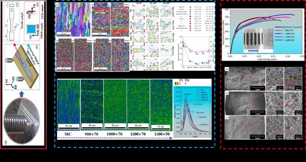 本研究采用搅拌摩擦加工对7055铝合金微观结构进行调控,经搅拌摩擦加工后,铝合金由不均匀的带状晶粒变成均匀而细小的等轴晶,晶粒尺寸从14μm细化到了0.71μm。因搅拌摩擦加工热输入引起的再结晶和高温软化的共同作用,大角度界面和织构强度均呈先增后降的趋势,就织构而言,搅拌摩擦加工后的铝合金总织构强度和体积分数显著降低,且 (RtG) 织构({110} <110>)、A织构({110} <111>)、E织构({110} <111>)、F织构({111} <112>)明显减少或消失,而Brass (B) 织构{110} <112>增加。搅拌摩擦加工铝合金屈服强度随着热输入(w/v) 的递增而降低,其主要取决于织构强化效应的弱化,但因晶界滑移引起的几何必须位错(GND)的增加,导致材料的形变硬化能力和塑性均得到显著提升。此外,利用Schmid定律计算了织构对铝合金塑性的影响,发现A织构、E织构及Cu织构的等效滑移系数(ESF)和最大施密特因子()均等于0,S织构的ESF和均较小,不利于材料的塑性变形,而ESF和分别为8和0.41的Cube织构({001} <100>)较多的1000×70的试样,获得较好的塑性。研究为高性能铝合金的加工、设计提供指导。