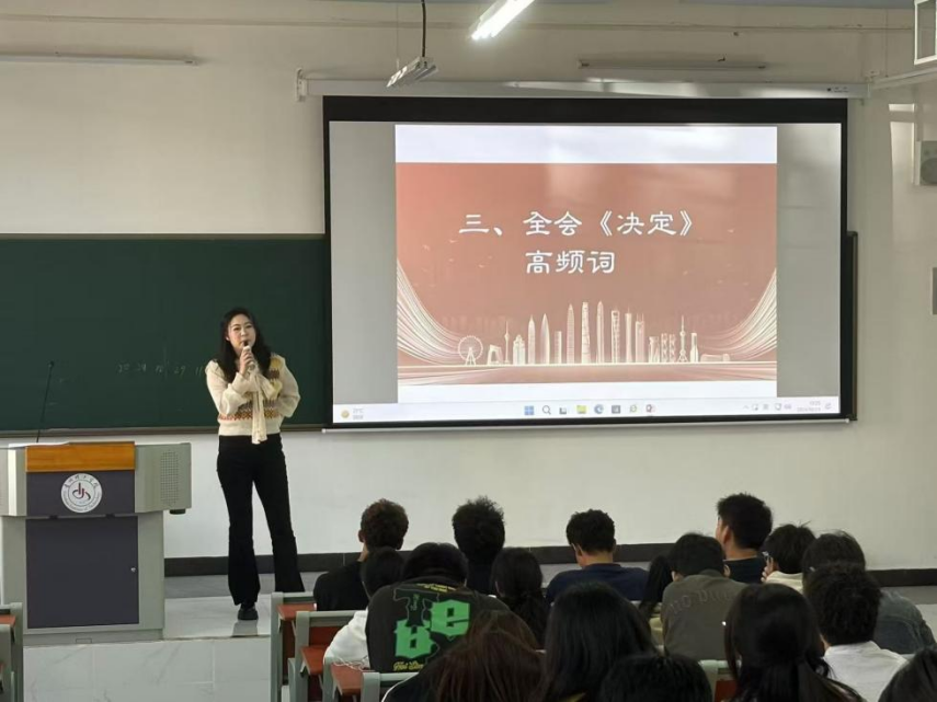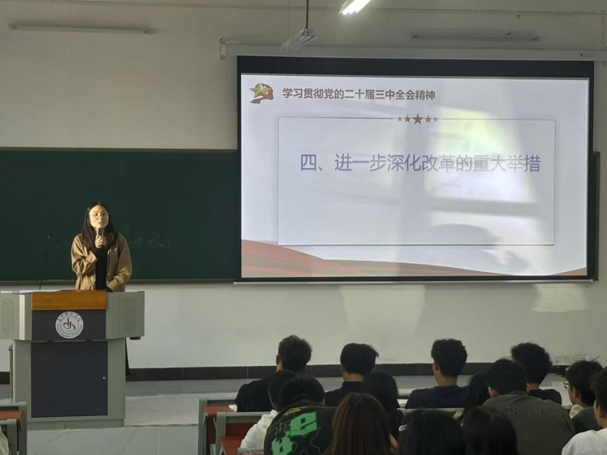 最后,韩青老师对全会中提出的进一步深化改革的重大举措进行了深入解读,鼓励全体学生,要把学习党的二十届三中全会精神与日常学习生活结合起来,坚定不移听党话、跟党走,厚植家国情怀,坚定理想信念,练就过硬本领,以实际行动为中国式现代化贡献青春力量。