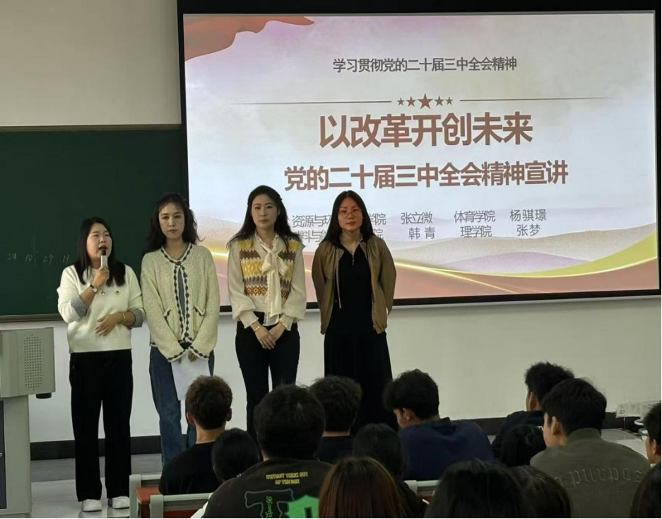 2024年10月29日,资源与环境工程学院、材料与能源工程学院、体育学院和理学院于敏学楼102教室开展党的二十届三中全会精神联合宣讲活动,各学院学生党员、学生代表积极参与。本次宣讲由资源与环境工程学院张立微老师、材料与能源工程学院韩青老师、体育学院杨骐璟老师、理学院张梦老师共同主讲。