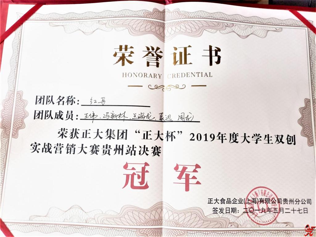 5月27日,由正大集团、贵州理工学院、贵州大学明德学院主办,贵州理工学院创新创业中心、贵州大学明德学院创业社承办的“正大杯”2019年大学生双创实战营销大赛贵州站决赛在贵州大学明德学院隆重举行。来自贵州省各大高校的5支团队进入了复赛。由我校董法宝老师担任指导教师,王伟、蒙迅、周龙、冯新林、王海龙五名学生组成“红马团队”从参赛队伍中脱颖而出,获得冠军,并获得川渝滇黔西南赛区总决赛参赛资格。
