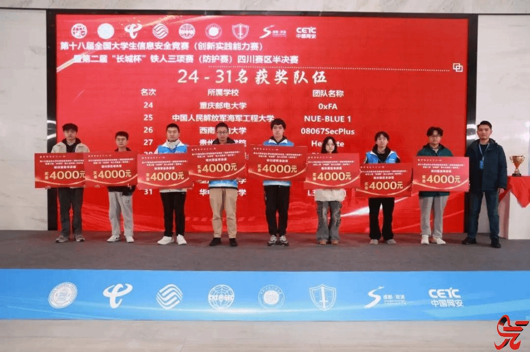 从四川赛区初赛中晋级的100支队伍,380名网安高手在半决赛中同台竞技。经过激烈角逐,由王俐老师指导的,杨秀榉、胡佳豪、吴兴旺、王凤欣四位同学组成的“HexByte”团队荣获二等奖;由王寅庆老师指导的,付志力、金玉桂、罗引瑞、卢来四位同学组成的“团团又队队”团队获得三等奖。